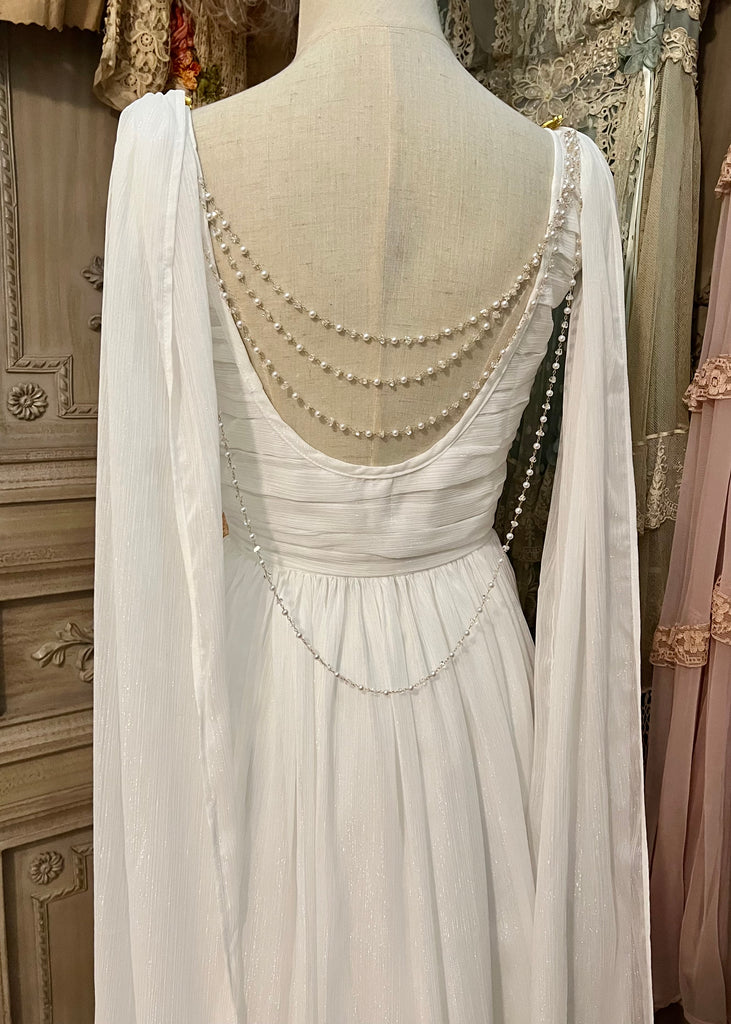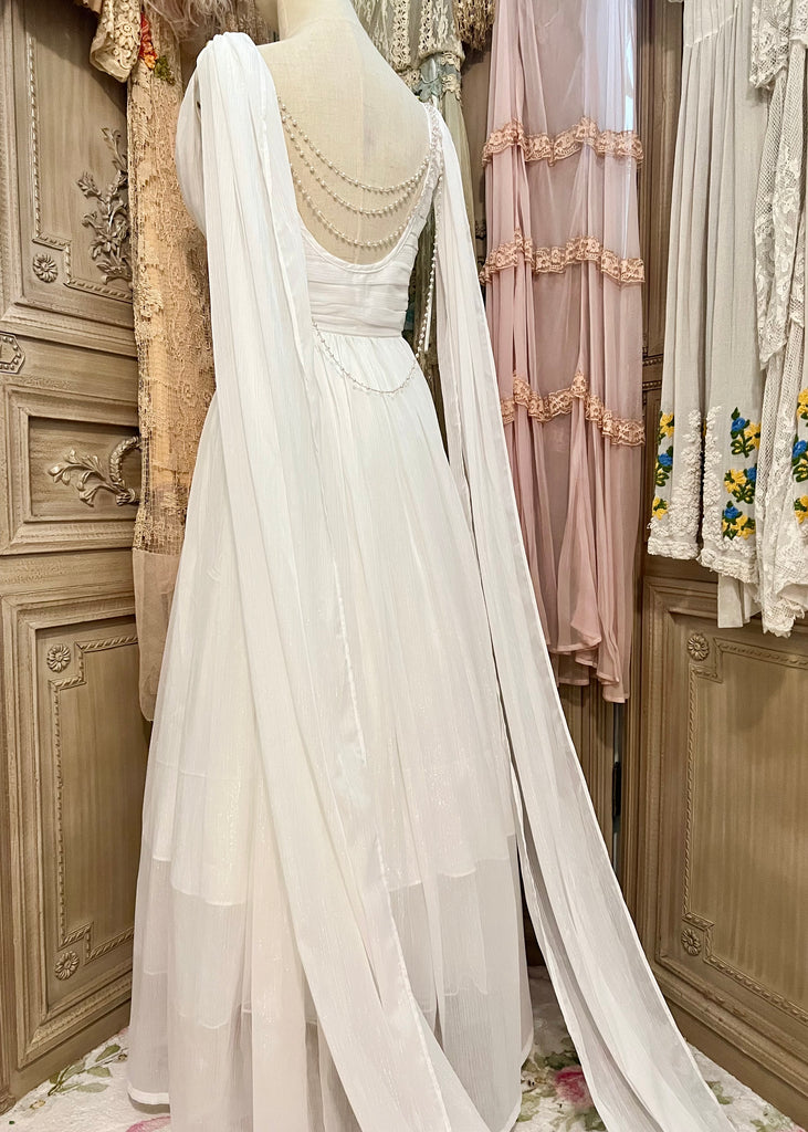 Pleated bodice, Neckline is adjustable, extended to a cape or a sleeveless style, with two long draped tailsย