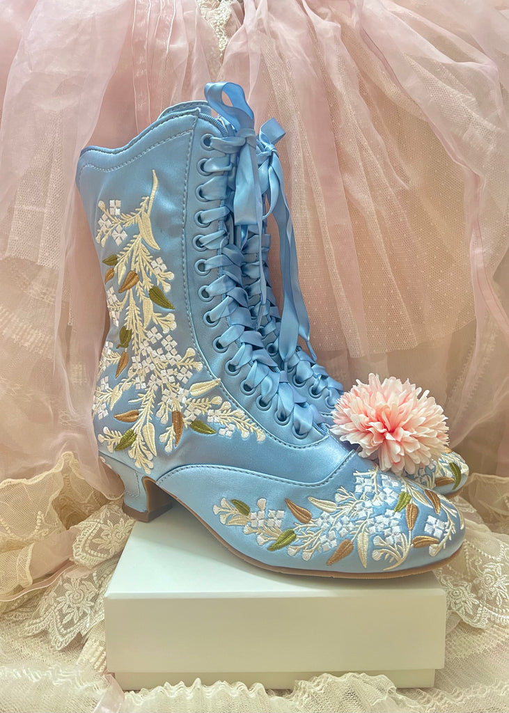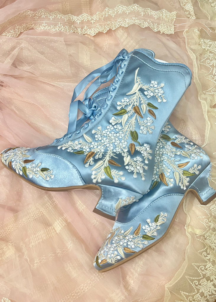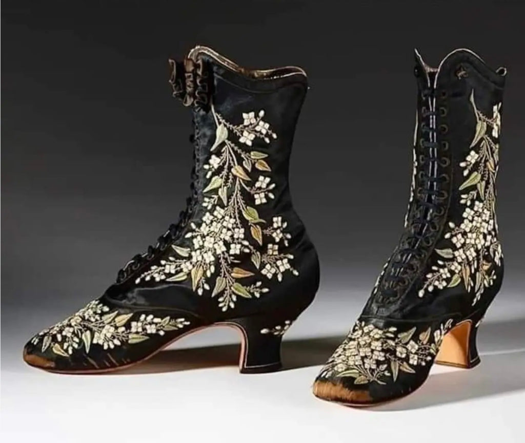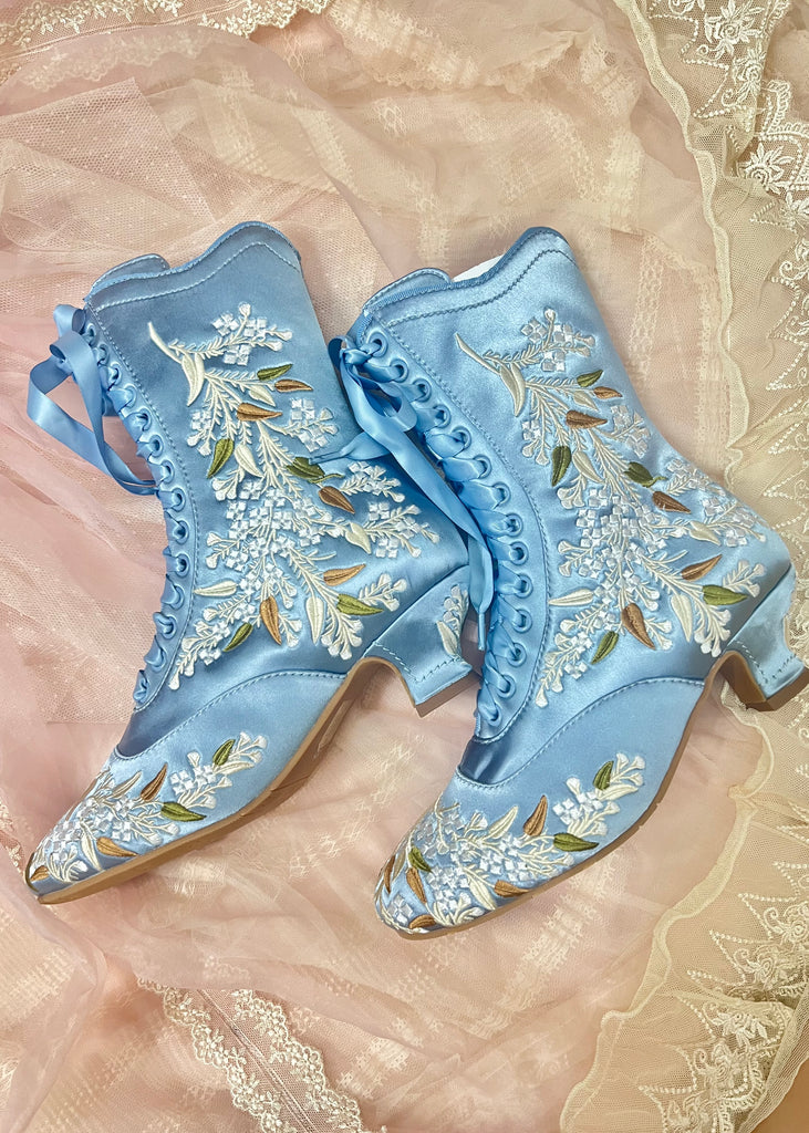 This heavenly embroidered boots is inspired and replica from 1870s boots by Françoise Pinet from Bâta shoe museum (image in the last image is the original pair in museum).  This unique look great for accurate reenactment, historical costuming or a boho shabby style combining with a modern outfit. They are sustainable , each piece is carefully made, heavily embroidered on delicate silk blended  satin fabrics, perfect for historical shoes collectors🏹comfortable to wear it for a whole day