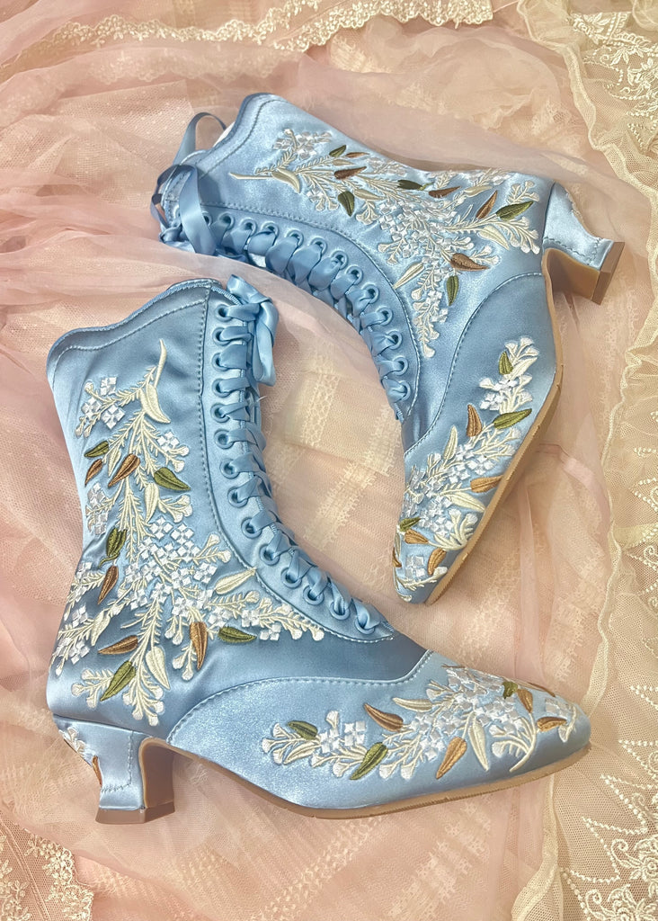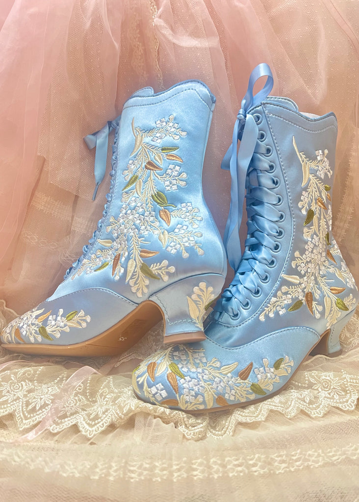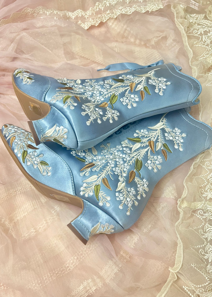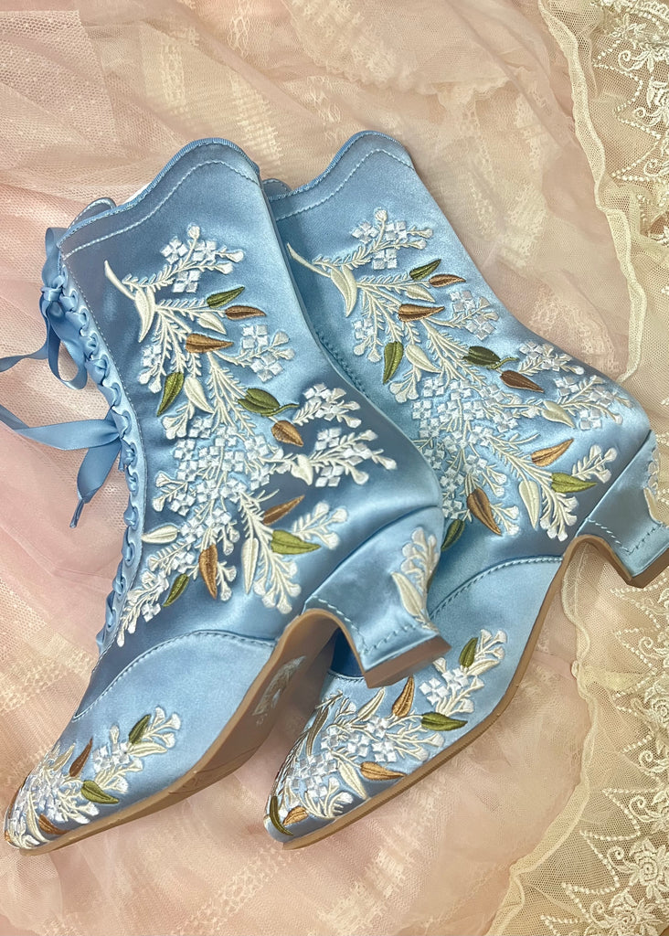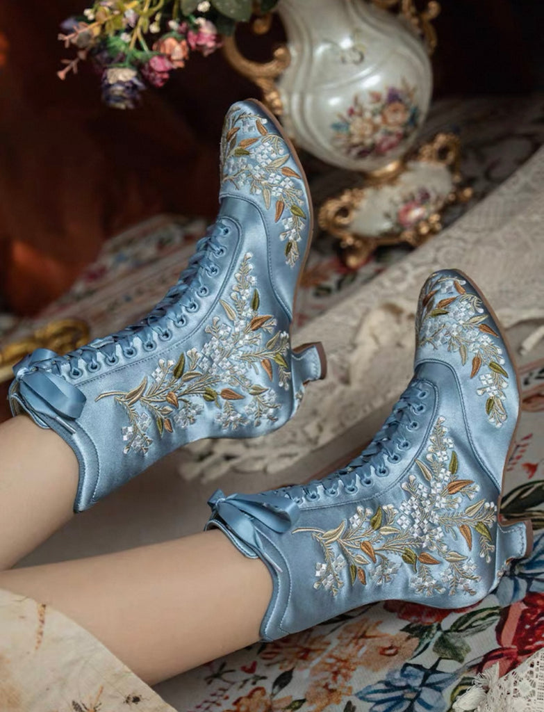This heavenly embroidered boots is inspired and replica from 1870s boots by Françoise Pinet from Bâta shoe museum (image in the last image is the original pair in museum).  This unique look great for accurate reenactment, historical costuming or a boho shabby style combining with a modern outfit. They are sustainable , each piece is carefully made, heavily embroidered on delicate silk blended  satin fabrics, perfect for historical shoes collectors🏹comfortable to wear it for a whole day