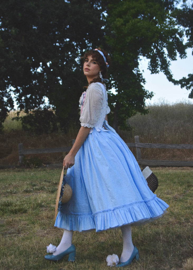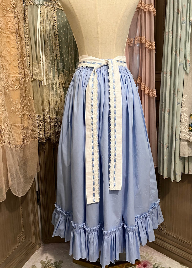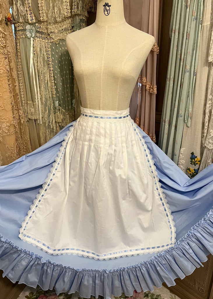 pintuck stitches details on the apron, ribbons go through lace trim all around it