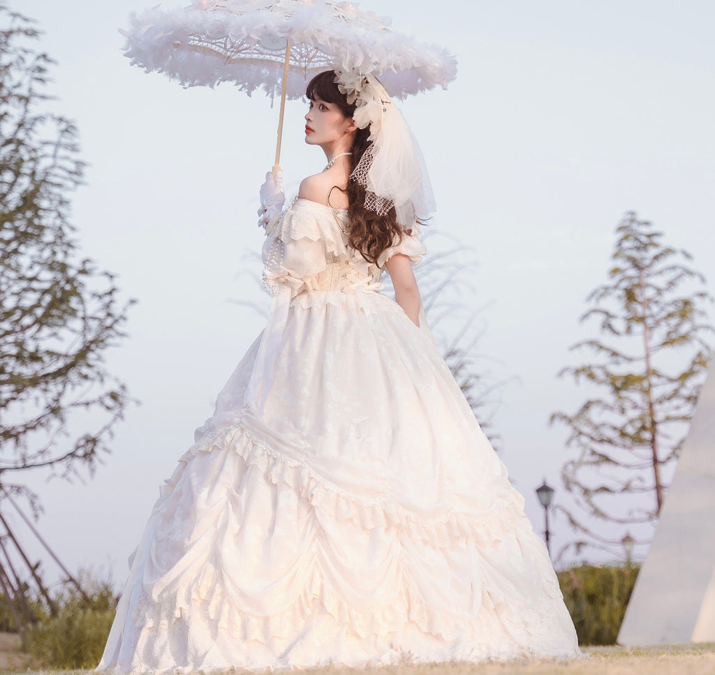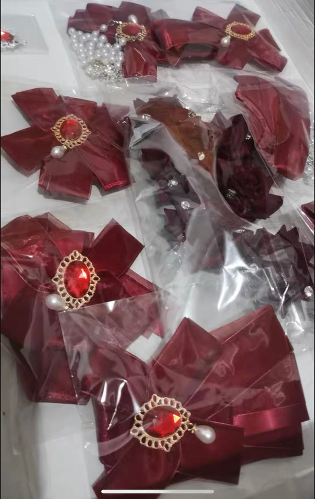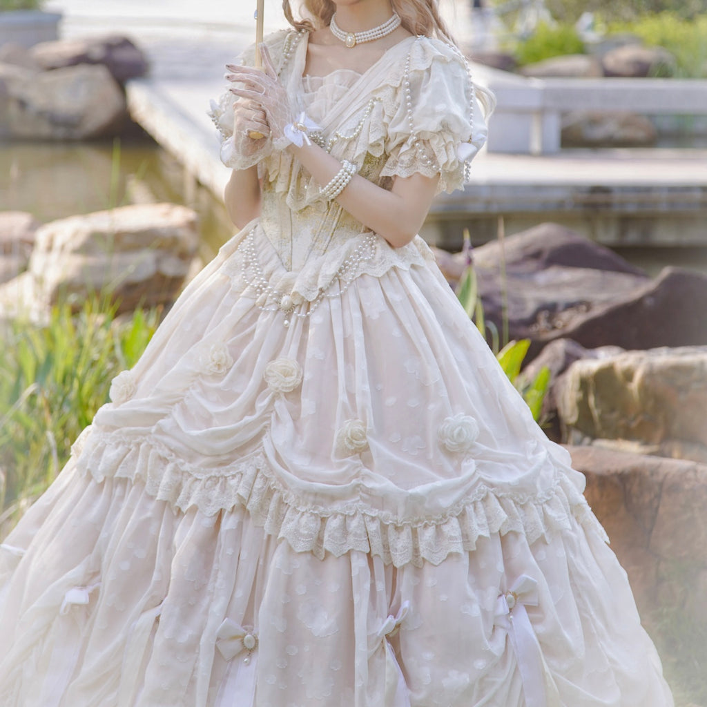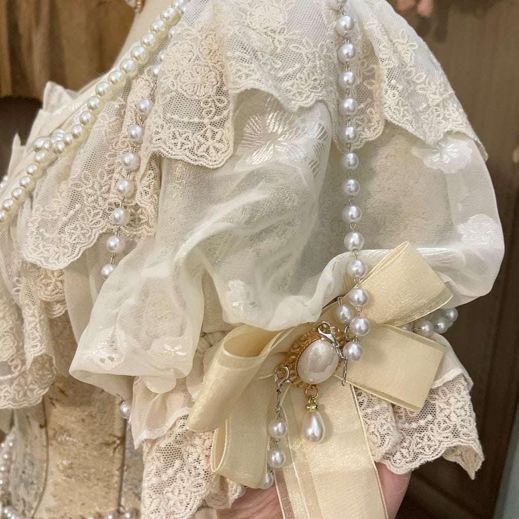 Gown set including detachable bow pins decoration and elaborate faux pearl chains and brooch.