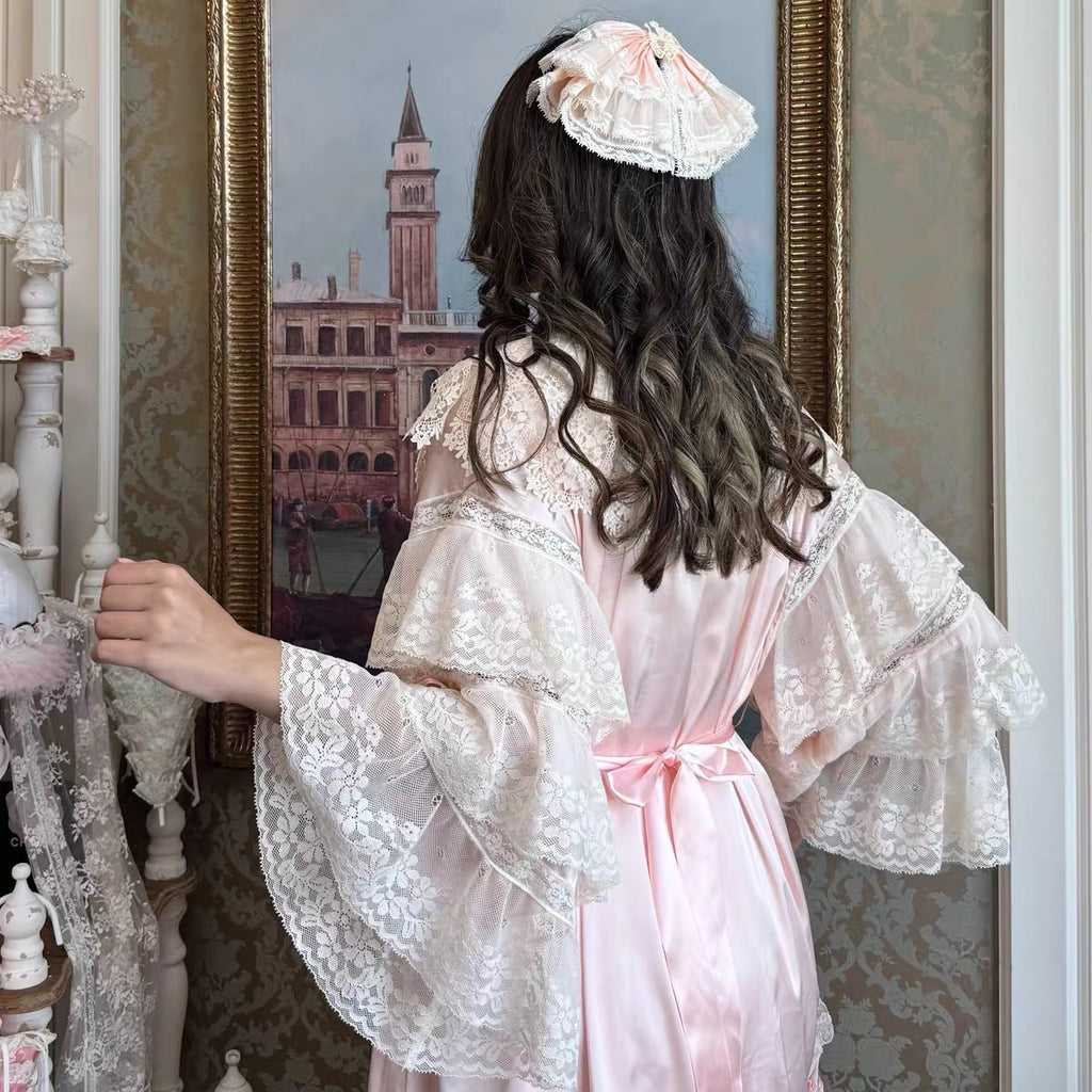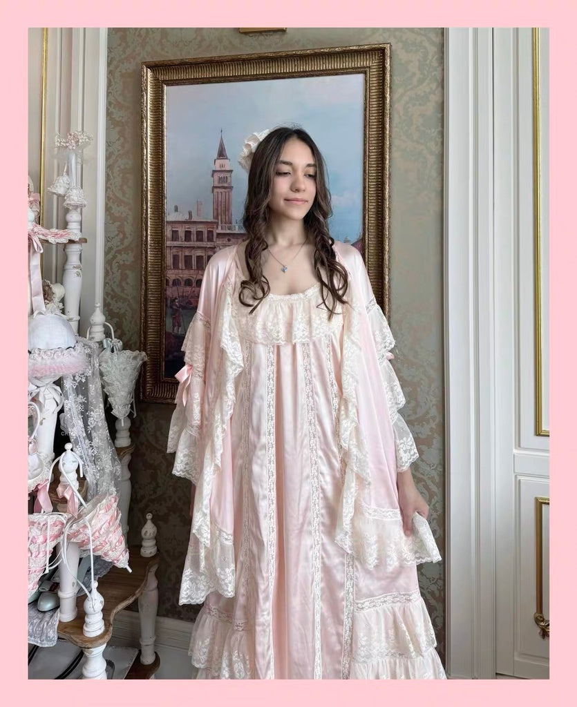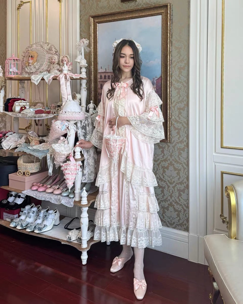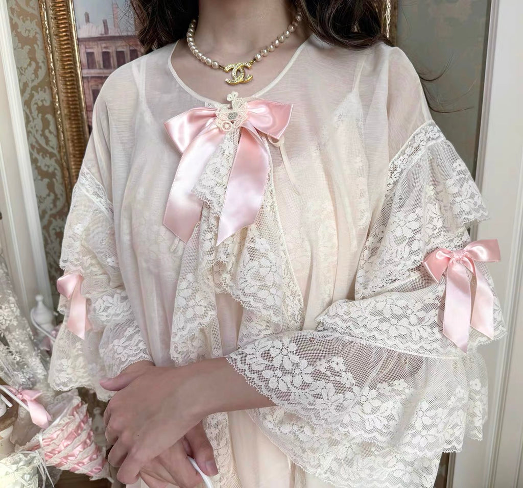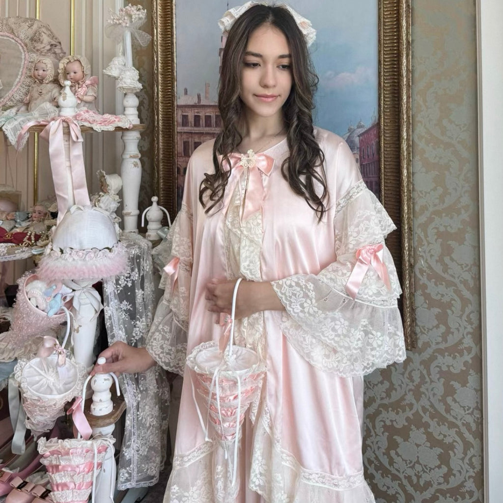 Price Includes bed jacket, slip dress, 2 pcs of detachable bowknots for cuffs, 1 pc of detachable brooch, 1 ribbon (waist ties).