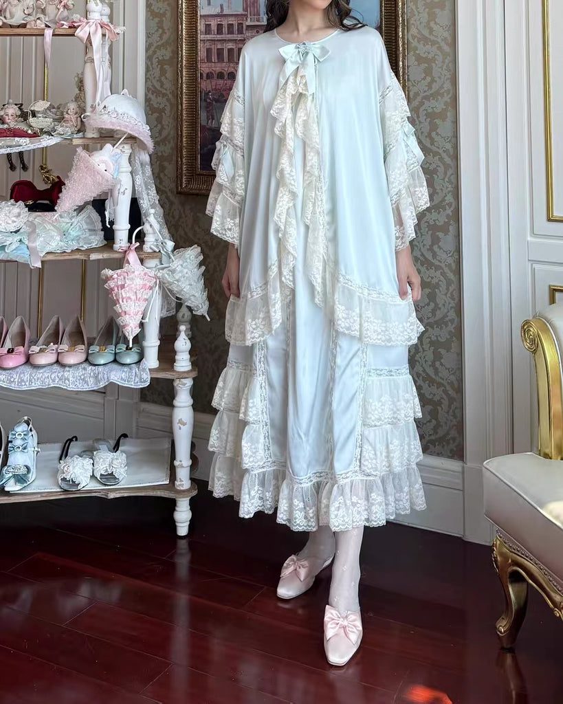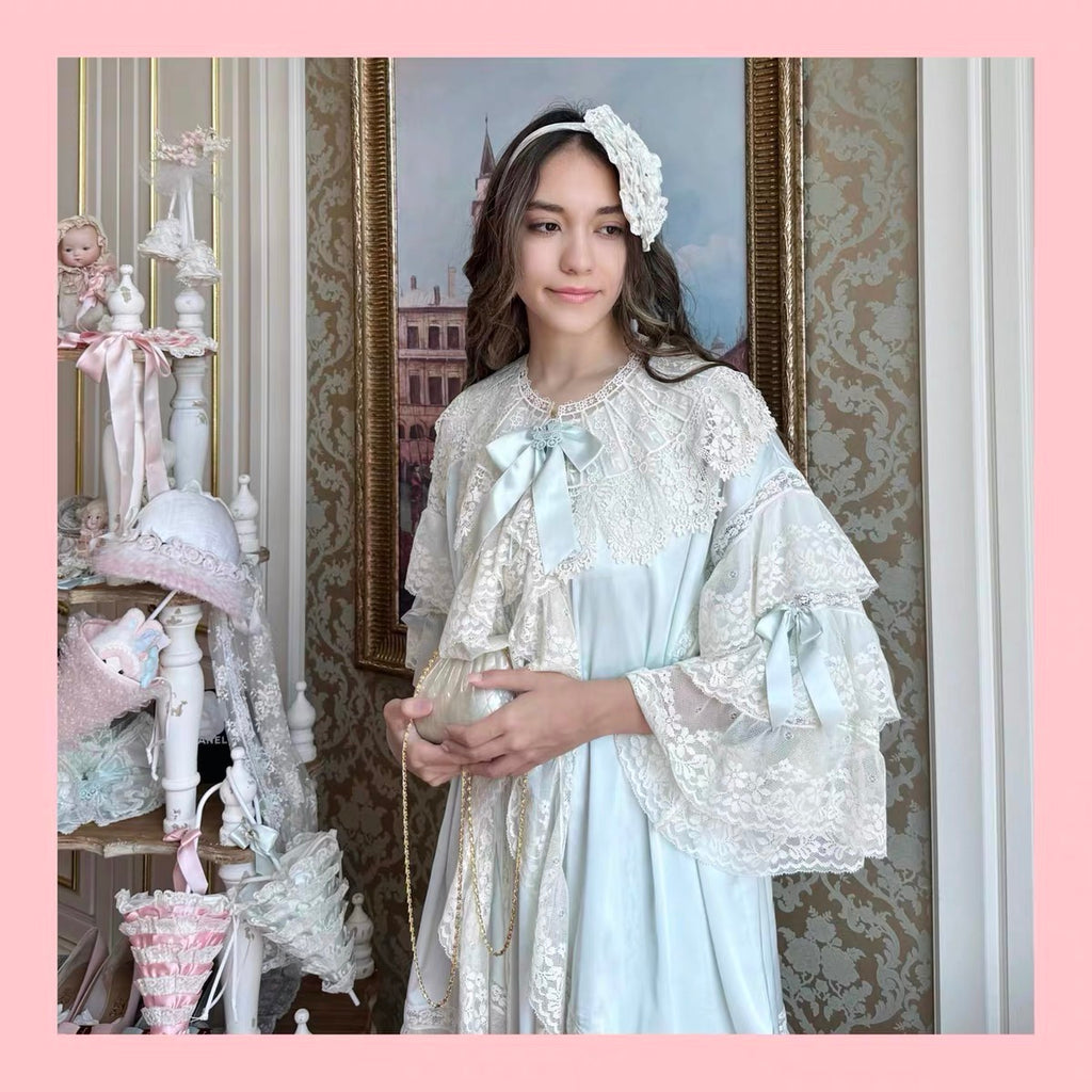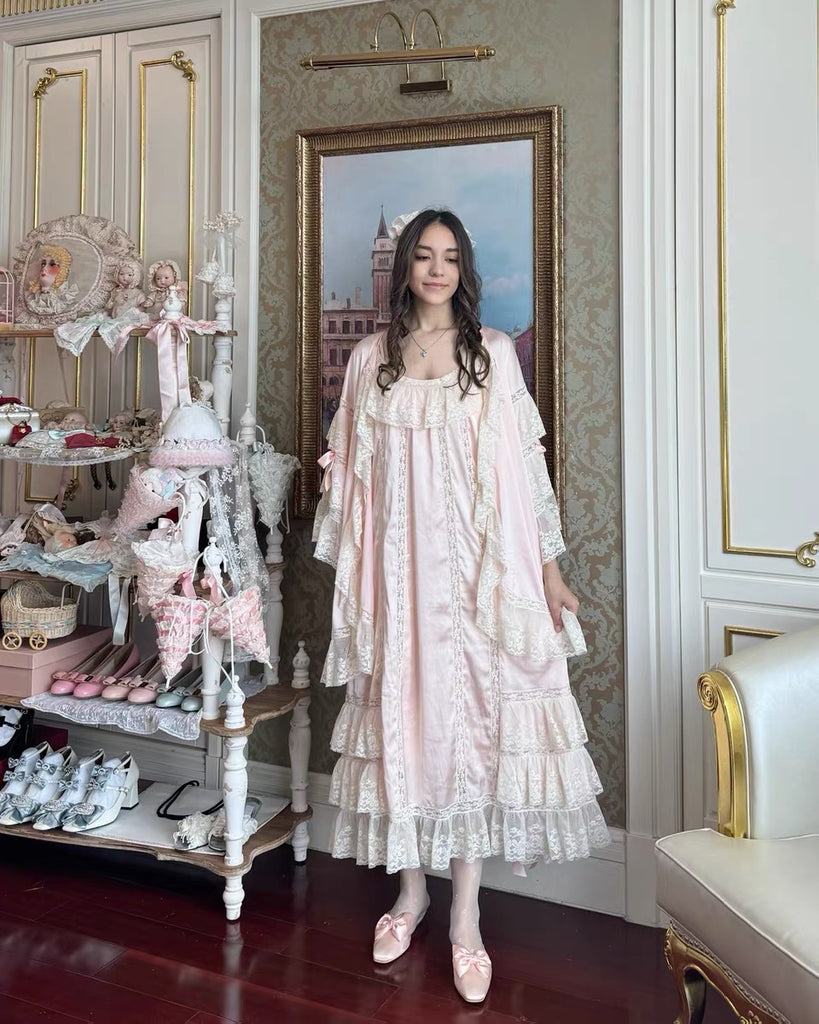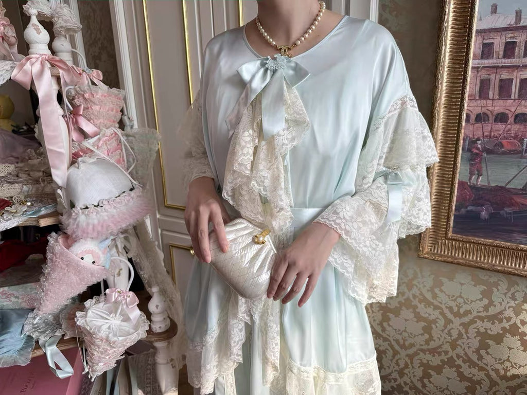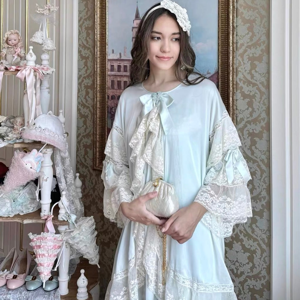 Price Includes bed jacket, slip dress, 2 pcs of detachable bowknots for cuffs, 1 pc of detachable brooch, 1 ribbon (waist ties).