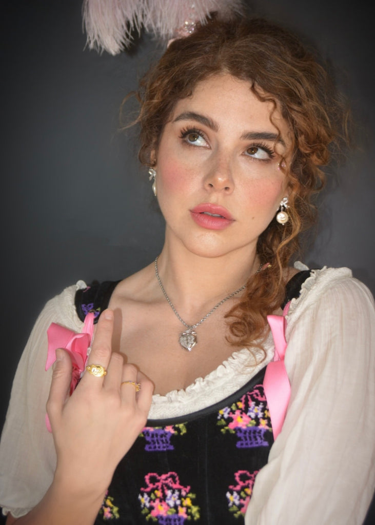 With hot pink shoulder strap matches the ribbon color on the flower basket